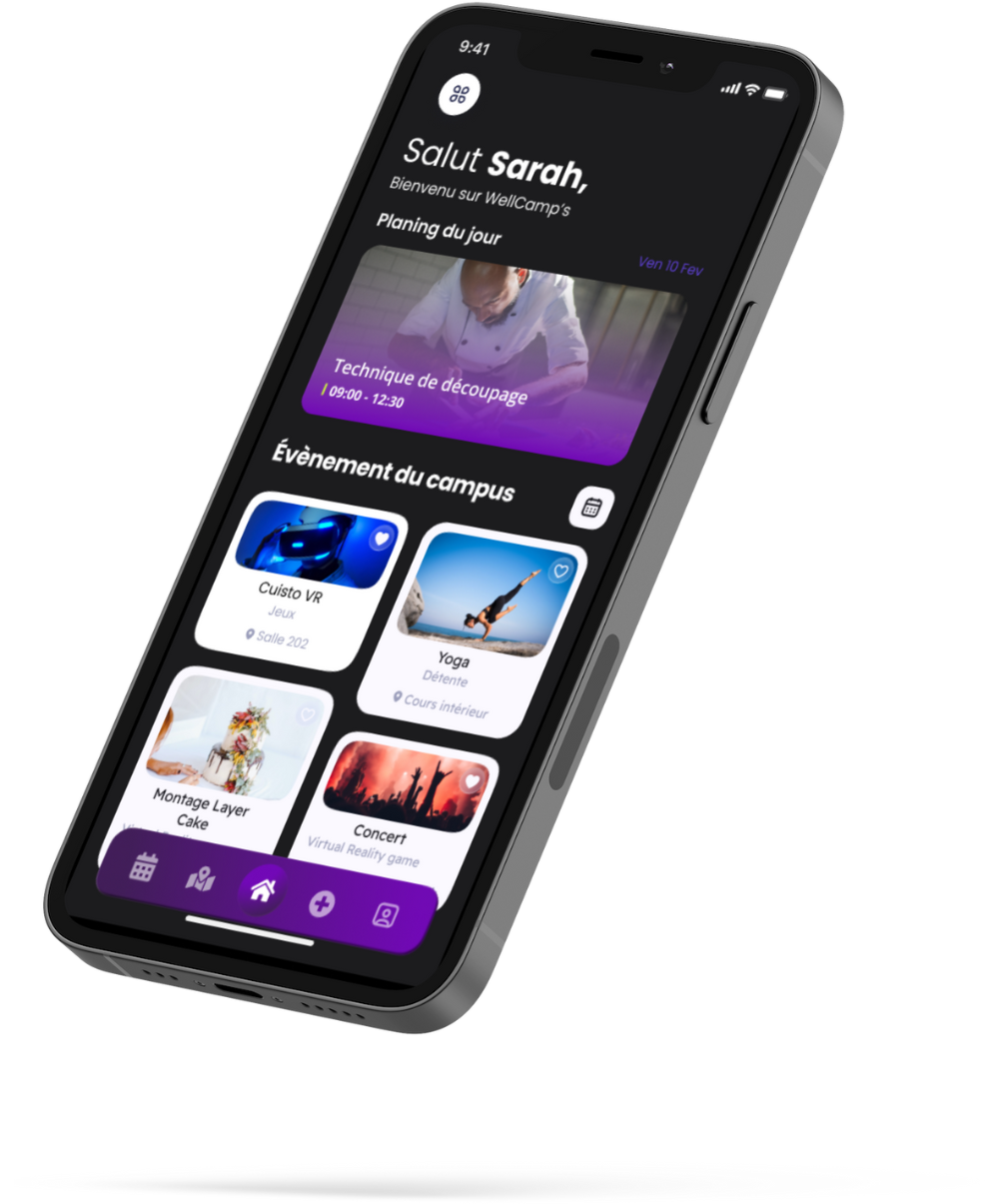 L'application mobile de Wellcamp's permet aux utilisateurs d'avoir toutes les informations dont ils ont besoin en un seul endroit, ce qui facilite leur vie sur le campus et leur permet de gagner du temps.